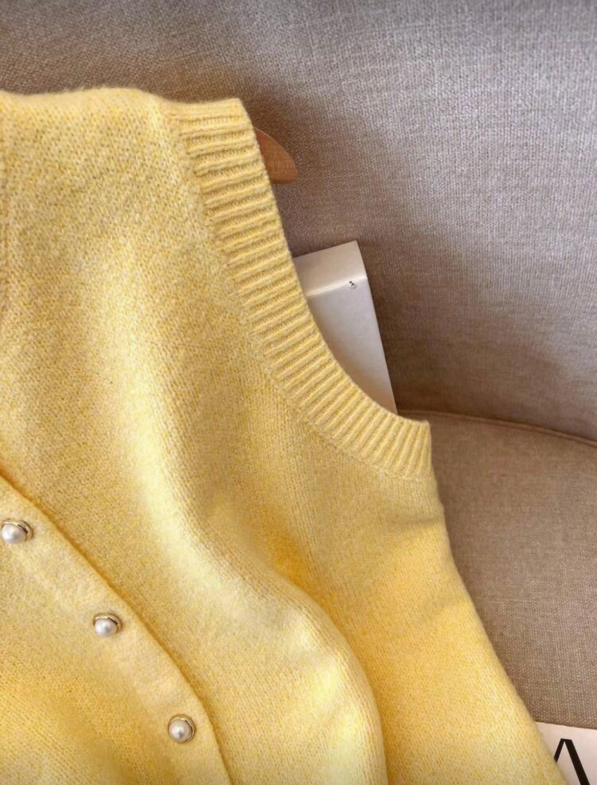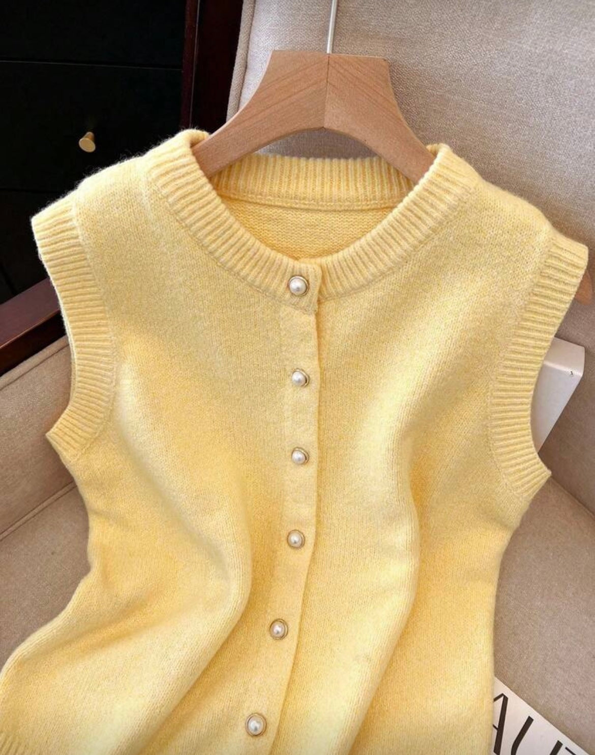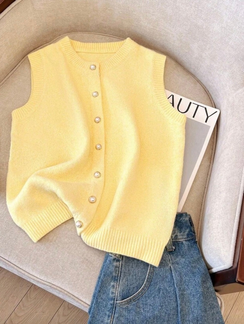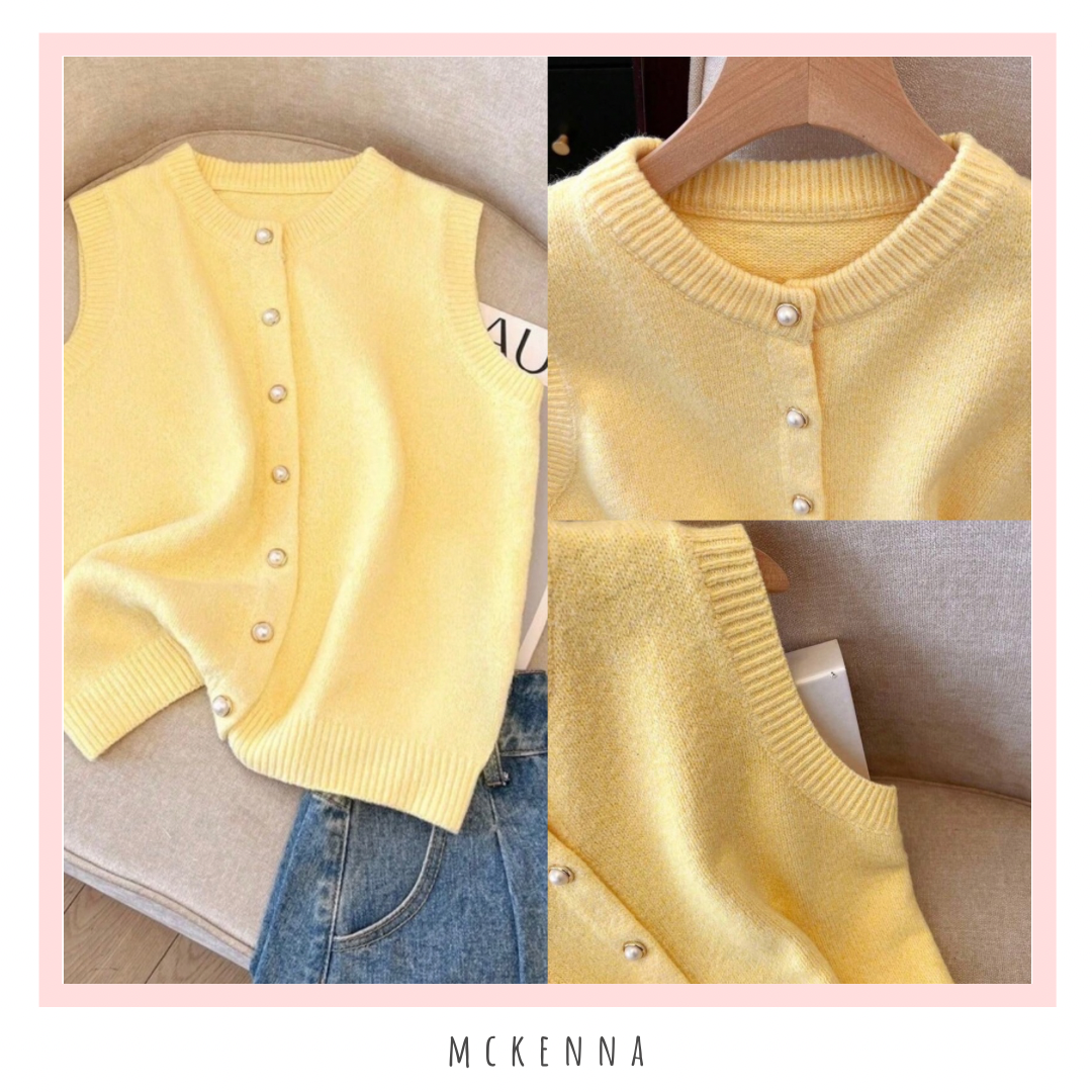 A soft luxurious sleeveless knit sweater with gold and pearl button details, which has endless styling options from jeans to shorts or formal pants.